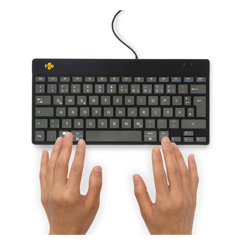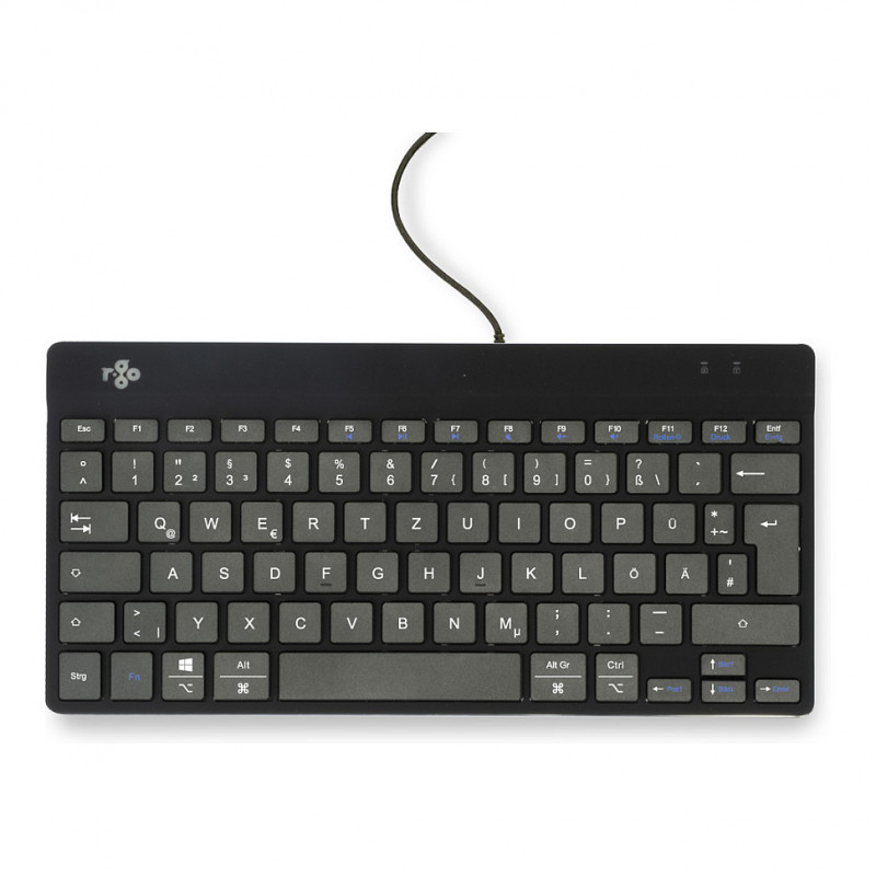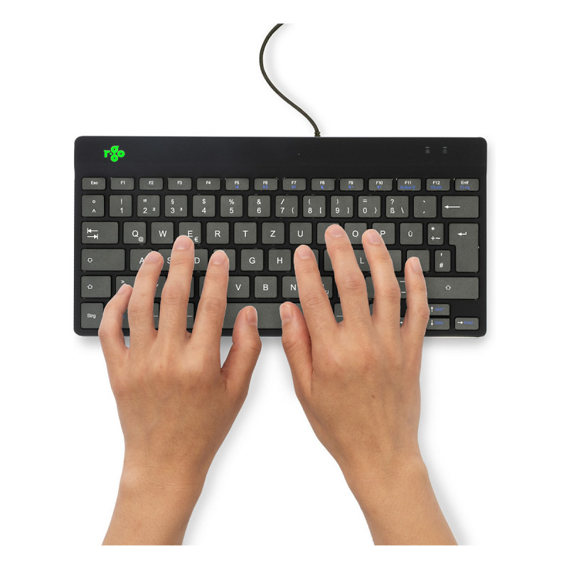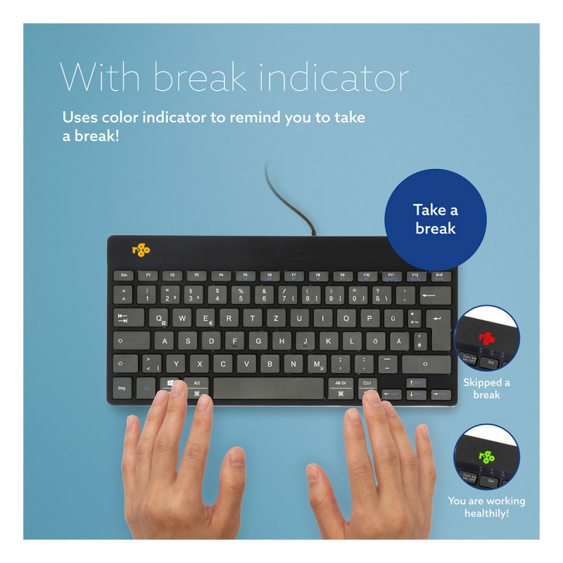 "R-Go Tools Ergonomic keyboard R-Go Compact Break, compact keyboard with break software, QWERTZ (DE), wired, black. Keyboard form factor: Mini. Keyboard style: Straight. Connectivity technology: Wired, Device interface: USB, Keyboard key switch: Scissor key switch, Keyboard layout: QWERTZ. Cable length: 1.6 m. Product colour: Black"\n"This compact keyboard has all the ergonomic features for healthy typing. The compact design ensures that your hands always remain within shoulder width when using keyboard and mouse simultaneously. The light keystroke reduces muscle tension while typing. The keyboard is ultra thin, so your hands and wrists are in a relaxed, natural position while typing. This ensures better blood flow to your hands. The R-Go Compact Break keyboard indicates with LED colour signals when it is time to take a break. As you type, the light changes colour, like a traffic light. When the light turns green, it means you are working healthily. Orange indicates it is time for a short break and red that you have been working too long. Taking short breaks during your working day will increase your concentration, prevent strain injuries and keep you fit during your working day. This product works together with the R-Go Break Software that won the Benelux Office Products Award 2021."