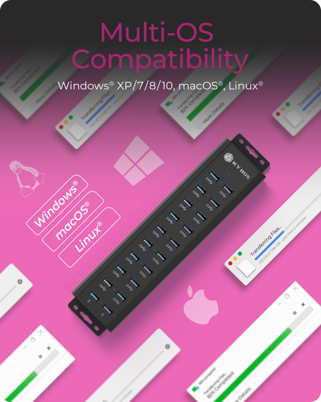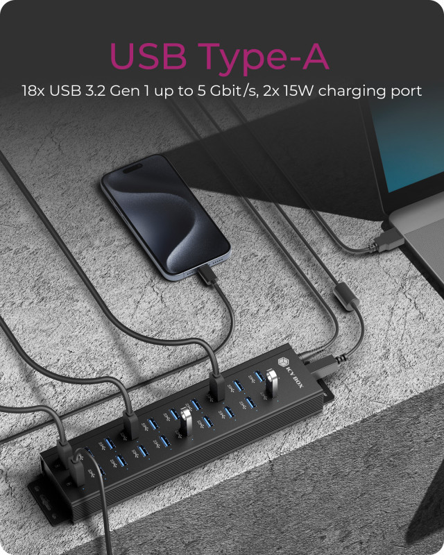 Raidsonic | 20-in-1 USB HUB with power supply, on/off button and mounting brackets | IB-HUB1720-U3