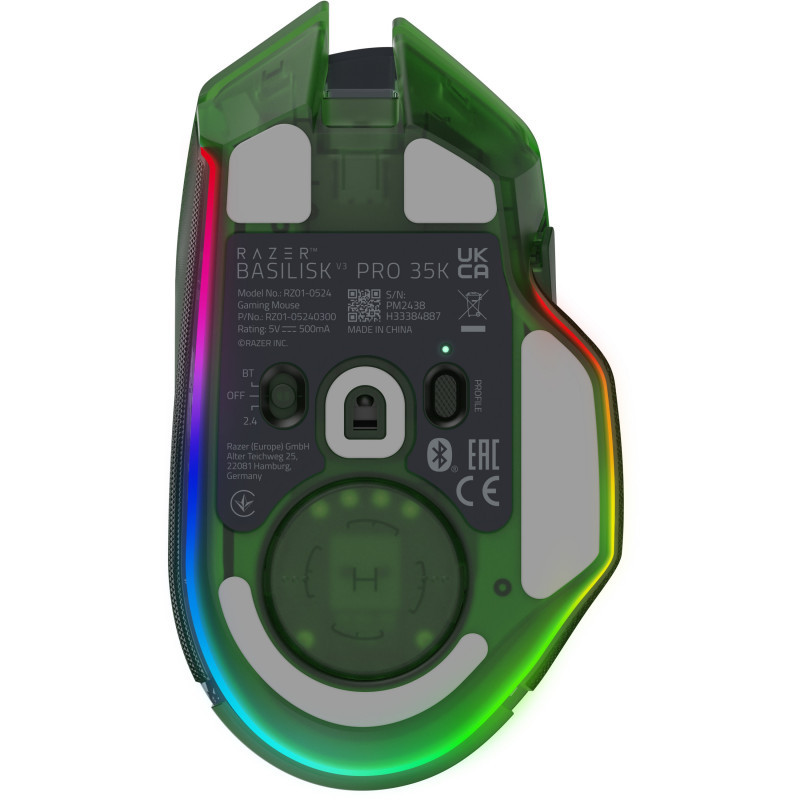 "Razer Basilisk V3 Pro 35K. Form factor: Right-hand. Movement detection technology: Optical, Device interface: RF Wireless + Bluetooth + USB Type-A, Movement resolution: 35000 DPI, Buttons type: Pressed buttons, Buttons quantity: 11, Scroll type: Wheel, Acceleration (max): 70 G. Illumination colour: Multi. Power source: Batteries/Cable. Product colour: Green"\n"RAZER BASILISK V3 PRO 35K