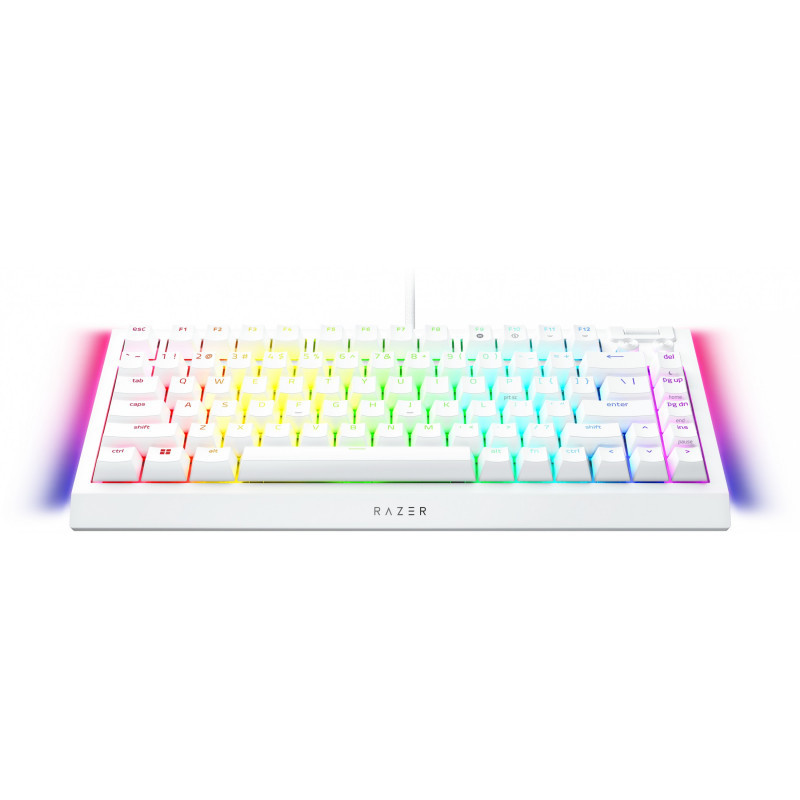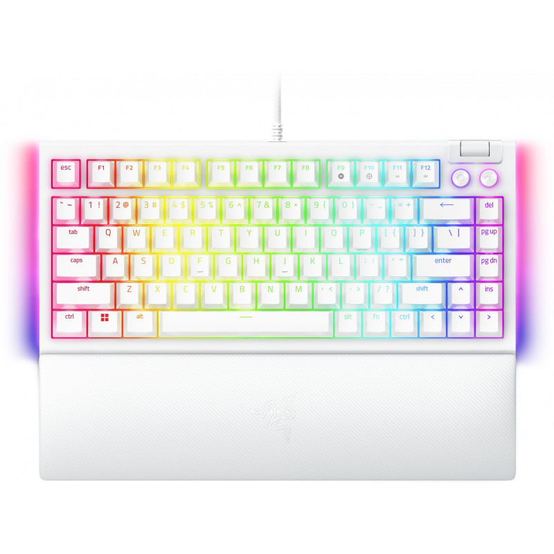 "Razer BlackWidow V4 75%. Keyboard form factor: 75%. Keyboard style: Straight. Connectivity technology: Wired, Device interface: USB, Keyboard key switch: Mechanical, Keyboard layout: QWERTY. Backlight type: RGB LED. Recommended usage: Gaming. Product colour: White"\n