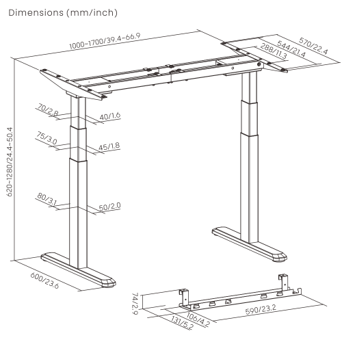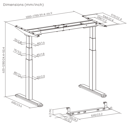 1000~1700x600x620~1280mm (39.4"~66.9"x23.6"x24.4"~50.4") |