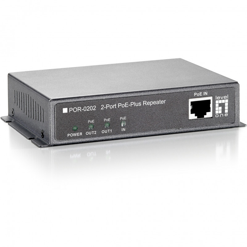 "LevelOne Gigabit PoE Repeater, Cascadable. Type: Network repeater, Maximum transfer distance: 100 m, Data transfer rate: 1000 Mbit/s. Cabling technology: 10/100/1000Base-T(X), Networking standards: IEEE 802.3af, IEEE 802.3x. Product colour: Black, LED indicators: PoE, Power, Country of origin: Taiwan. Power consumption (max): 2.5 W. Width: 90 mm, Depth: 120 mm, Height: 28 mm"\n"For system integrators looking for a professional solution to help extend their PoE network, POR-0120 is the perfect accessory to increase your Power over Ethernet network performance. LevelOne POR-0120, a 1-Port Gigabit PoE Repeater requiring neither configuration nor electrical power, is an innovative transmitter to pass on both data and power extend to another 100 meters. The delivery though one PoE port and one non-PoE port are adequate to extend network devices such as WLAN Access Points, Network Cameras and other appliances with high-speed to the network for greater deployment flexibility.
