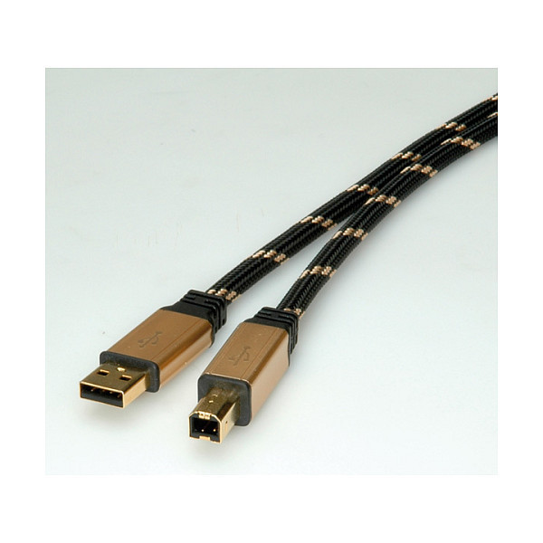 "ROLINE GOLD USB 2.0 Cable, A - B, M/M 3.0 m. Cable length: 3 m. Connector 1: USB A, Connector 2: USB B, USB version: USB 2.0, Connector gender: Male/Male, Connector contacts plating: Gold, Product colour: Black, Gold"\n"USB 2.0 Hi-Speed cable with high quality and improved shielding.
