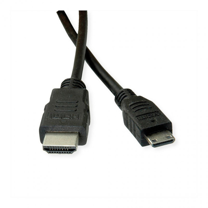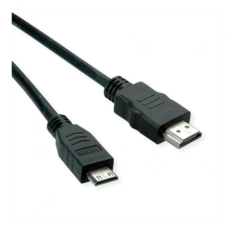 "ROLINE 11445580. Cable length: 2 m, Connector 1: HDMI Type A (Standard), Connector 1 gender: Male, Connector 2: HDMI Type C (Mini), Connector 2 gender: Male, Connector contacts plating: Gold, 3D, Audio Return Channel (ARC), Product colour: Black"\n"For the connection of e. g. mobile phones / smartphones or digital cameras / DSLRs.