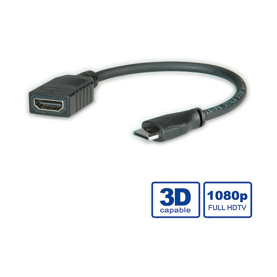 "ROLINE HDMI High Speed Cable with Ethernet, HDMI Type A F - HDMI Type C M 0.15 m. Cable length: 0.15 m, Connector 1: HDMI Type A (Standard), Connector 1 gender: Female, Connector 2: HDMI Type C (Mini), Connector 2 gender: Male, Maximum resolution: 1920 x 1080 pixels, Product colour: Black"\n"For the connection of e. g. mobile phones, smart phones, PDAs, digital cameras.