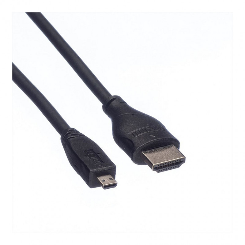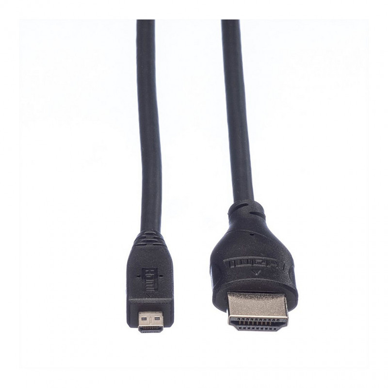 "ROLINE HDMI High Speed Cable + Ethernet, A - D, M/M 2 m. Cable length: 2 m, Connector 1: HDMI Type A (Standard), Connector 1 gender: Male, Connector 2: HDMI Type A (Standard), Connector 2 gender: Male, Audio Return Channel (ARC), Product colour: Black"\n"For the connection of e. g. mobile phones / smartphones or digital cameras / DSLRs."