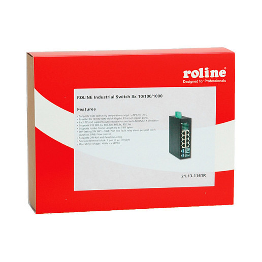"ROLINE Gigabit Ethernet Industrial Switch, 8x. Switch type: Unmanaged. Basic switching RJ-45 Ethernet ports type: Gigabit Ethernet (10/100/1000), Basic switching RJ-45 Ethernet ports quantity: 8. Full duplex. Power connector: DC-in jack. Rack mounting"\n"