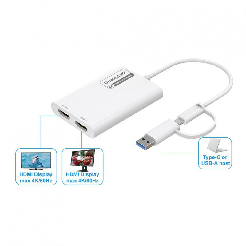 "ROLINE 12.03.3206. USB version: 2.0/3.2 Gen 1 (3.1 Gen 1), USB connector type: USB Type-A, USB Type-C, USB connector gender: Male. Product colour: White. Width: 61 mm, Depth: 90 mm, Height: 14 mm. Package width: 60 mm, Package depth: 90 mm, Package height: 20 mm"\n"Mirror or extend the display of your USB Type-A/C device to up to two HDMI displays - with a maximum resolution of 3840x2160 @60Hz!