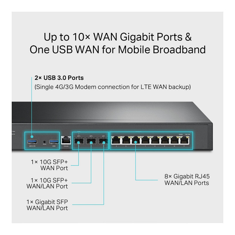 Up to 10× WAN SFP+, SFP, and RJ45 ports allow the router to support various internet access requirements. Multi-WAN Load Balancing distributes data streams according to the bandwidth proportion of every WAN port to raise the utilization rate of multi-line broadband. Connect a 4G/3G modem to one of the USB 3.0 ports for LTE WAN backup.
