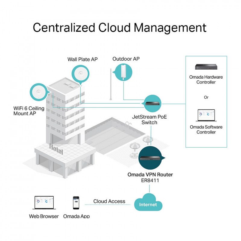 The Omada Software Defined Networking (SDN) platform integrates network devices including access points, switches, and routers to provide 100% centralized cloud management and create a highly scalable network—all controlled from a single interface."