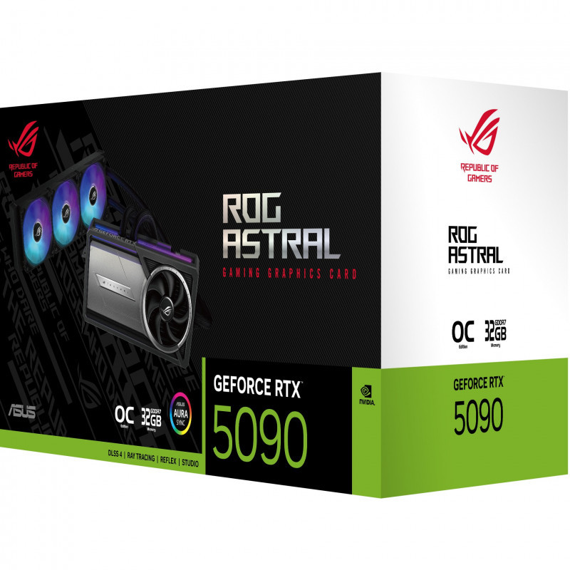 "ASUS ROG Astral - -LC-RTX5090-O32G-GAMING. Graphics processor family: NVIDIA, Graphics processor: GeForce RTX 5090. Discrete graphics card memory: 32 GB, Graphics card memory type: GDDR7, Memory bus: 512 bit. Maximum resolution: 7680 x 4320 pixels. OpenGL version: 4.6. Interface type: PCI Express 5.0. Cooling type: Active, Number of fans: 4 fan(s), Illumination colour: Multi"\n"ROG Astral LC GeForce RTX™ 5090