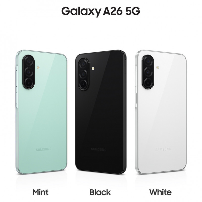 "Samsung Galaxy A26. Display diagonal: 17 cm (6.7""), Display resolution: 1080 x 2340 pixels. Processor family: Samsung Exynos. RAM capacity: 6 GB, Internal storage capacity: 128 GB. Rear camera resolution (numeric): 50 MP, Rear camera type: Triple camera. SIM card capability: Hybrid Dual SIM. Operating system installed: Android 15. Battery capacity: 5000 mAh. Product colour: Black. Weight: 200 g"\n"Slim. Shiny. Stylish
