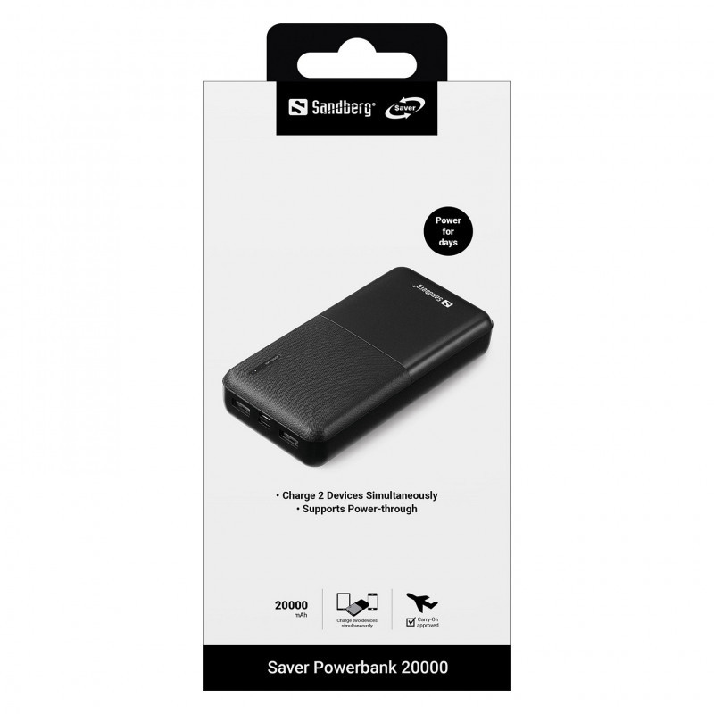 "Sandberg Saver Powerbank 20000. Battery capacity: 20000 mAh, Battery technology: Lithium Polymer (LiPo). USB Type-A output ports: 2. Product colour: Black"\n"Sandberg Saver Powerbank 20000 provides you with plenty of extra power on the go with fast charging via both USB-C and USB-A. The large capacity ensures multiple full charges for your devices, so you can keep going for days. Perfect for travel, festivals, and long days away from the outlet. Take the power with and you are always ready."