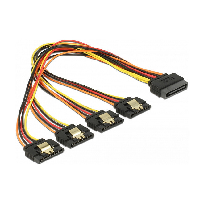 "DeLOCK Cable Power SATA 15pin > 2x SATA HDD – straight. Connector 1: 15pin SATA, Connector 2: 2x SATA, Cable length: 0.15 m"\n"This power cable enables you to connect and supply power to 2 SATA hard disks via one SATA 15pin port of a power supply."