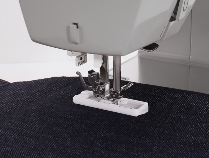 11 Built-in Stitches; 1100 Stitches per Minute; Stainless Steel Bed Plate; Top Drop-In Bobbin with Clear View Cover; Automatic 4-Step Buttonhole; Snap-On Presser Feet; Heavy Duty Metal Frame; Extra-High Presser Foot Lifter; Adjustable Presser Foot Pressure Control. |