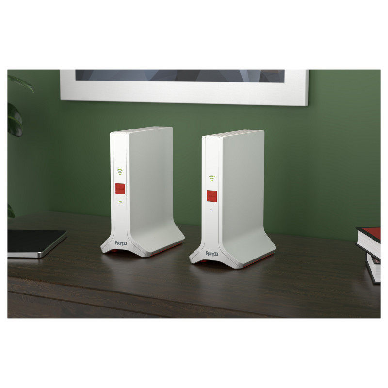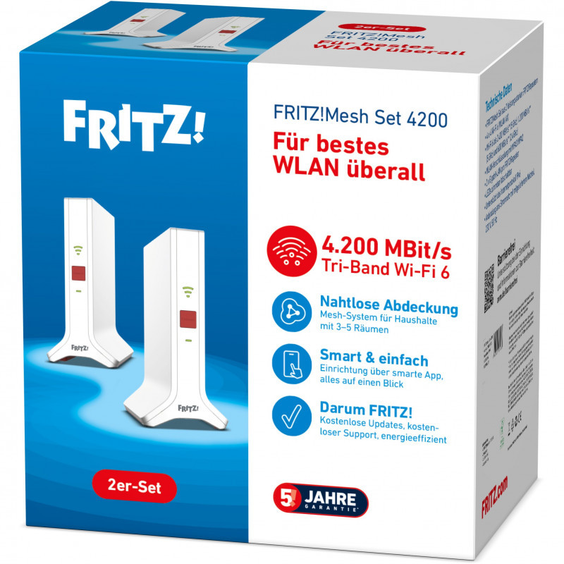 "Mesh Set 4200. Product colour: Red, White, Antenna type: 2x2/4x4, Product type: Network repeater. Wi-Fi band: Dual-band (2.4 GHz / 5 GHz), Top Wi-Fi standard: Wi-Fi 6E (802.11ax), WLAN data transfer rate (max): 4200 Mbit/s. Power consumption (typical): 9 W, AC input voltage: 230 V, AC input frequency: 50 Hz. Width: 90 mm, Depth: 145 mm, Height: 190 mm"\n