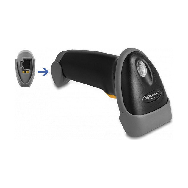 "DeLOCK USB Barcode Scanner 1D with connection cable and stand - Laser - black. Type: Handheld bar code reader, Scanner type: 1D, Sensor type: Laser. Connectivity technology: Wired, Standard interfaces: RJ-50, Cable length: 2 m. Product colour: Black, Protection features: Drop proof. Power source type: USB, Input voltage: 5 V, Power consumption: 262 mA. Weight: 120 g, Width: 82 mm, Depth: 65 mm"\n"This barcode laser scanner by Delock can be connected directly to a PC or laptop. Alternatively, an adapter can be used to connect the scanner to a mobile phone or tablet. Up to 200 scans per second of all common 1D barcode types can be precisely captured, even at long distances. Additionally, the scanner recognizes barcodes displayed on displays and monitors.