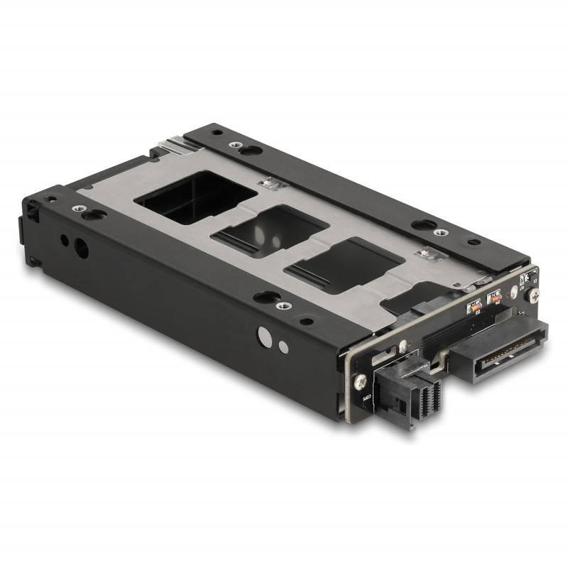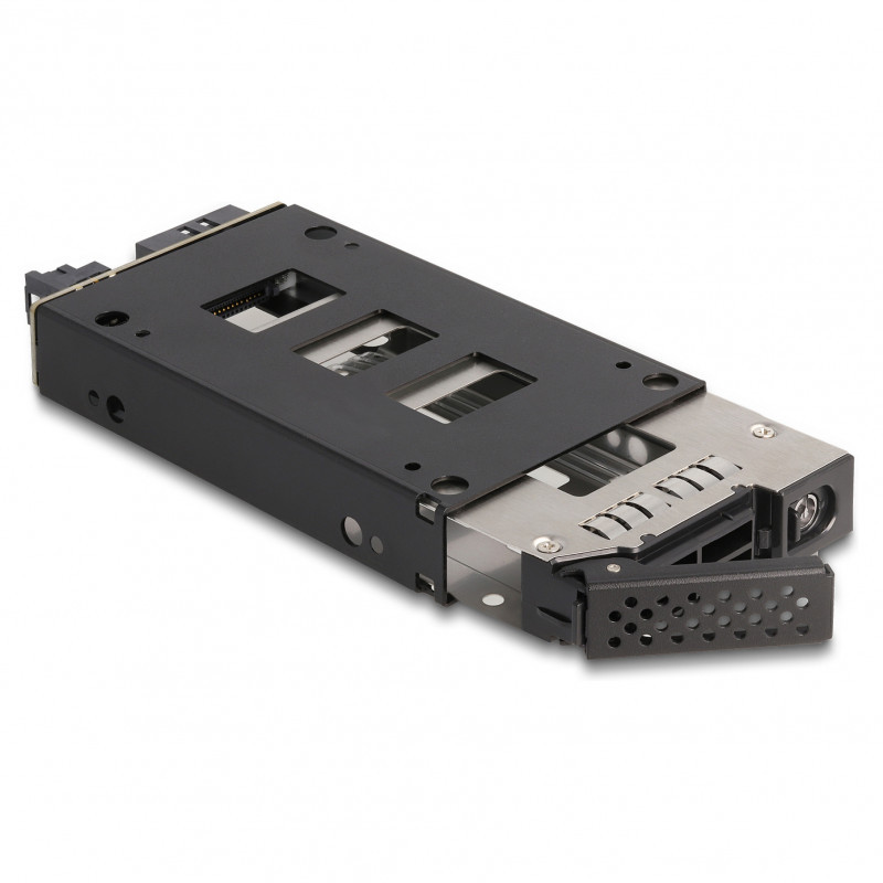 "DeLOCK Slim Bay Mobile Rack for 1 x 2.5″ U.2 NVMe SSD. Size (imperial): 2.5"", Type: Storage drive tray, Product colour: Black, Silver. Width: 72 mm, Depth: 140 mm, Height: 21 mm. Quantity per pack: 1 pc(s), Number of lock keys included: 2 pc(s). Windows operating systems supported: Windows 10, Windows 11, Windows 8.1, Linux operating systems supported: Linux Kernel 5.8, Linux Kernel 5.9. Country of origin: China"\n"This solid metal mobile rack by Delock can be installed into a free 3.5″ or 5.25″ bay of a PC by the help of an optional frame. Furthermore, it is also possible to use the mobile rack directly in a server rack or 19″ storage enclosure.