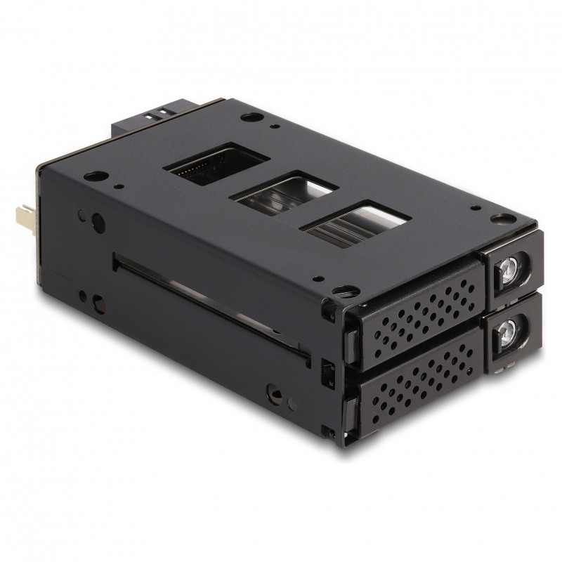 "DeLOCK Slim Bay Mobile Rack for 2 x 2.5″ U.2 NVMe SSD with 5.25″ frame. Size (imperial): 2x 2.5"", Type: Storage drive tray, Product colour: Black. Width: 140 mm, Depth: 145 mm, Height: 42 mm. Quantity per pack: 1 pc(s), Number of lock keys included: 2 pc(s). Windows operating systems supported: Windows 10, Windows 11, Windows 8.1, Linux operating systems supported: Linux Kernel 5.8, Linux Kernel 5.9. Country of origin: China"\n"This solid metal mobile rack by Delock can be installed into a free 5.25″ bay of a PC by the help of the included frame. Furthermore, it is also possible to use the mobile rack directly in a server rack or 19″ storage enclosure.