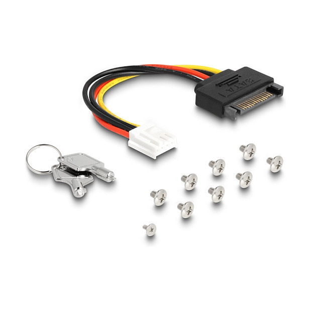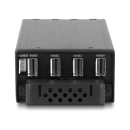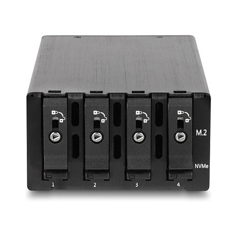 "DeLOCK Slim Bay Mobile Rack for 4 x M.2 NVMe SSD with Slim SAS SFF-8654 connector. Type: Storage drive tray, Product colour: Black, SSD interface: PCI Express 4.0. Width: 72 mm, Depth: 174 mm, Height: 40 mm. Quantity per pack: 1 pc(s), Number of lock keys included: 2 pc(s). Windows operating systems supported: Windows 10, Windows 10 x64, Windows 11, Linux operating systems supported: Linux Kernel 6.2"\n"Description