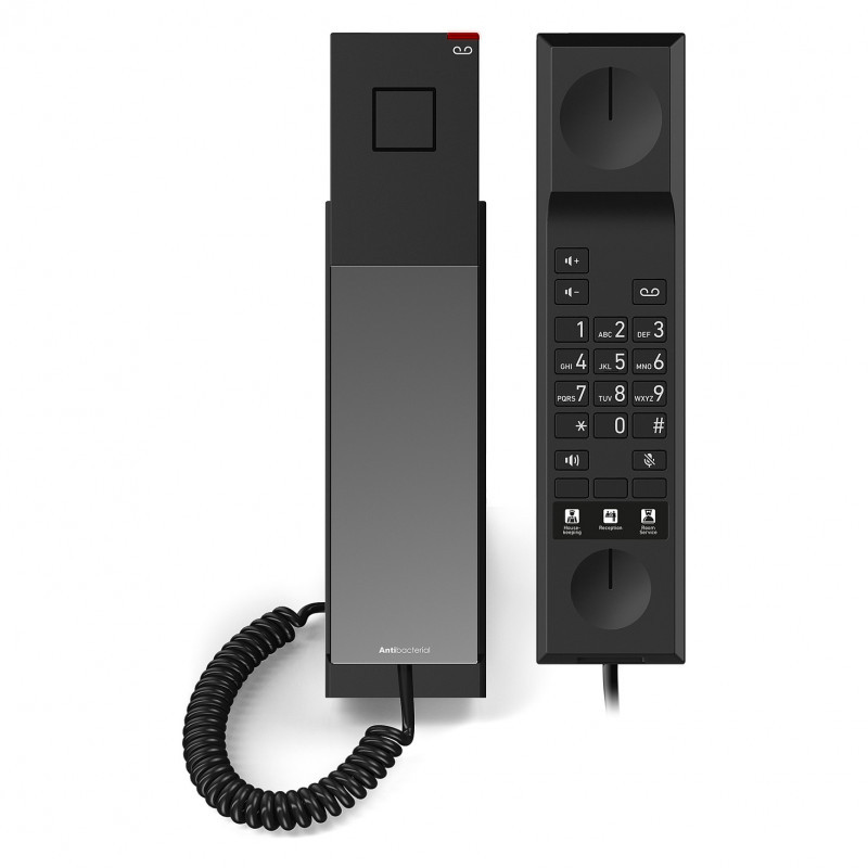 The Snom HD300A is a cleverly designed, corded analogue telephone that has been specially developed for the requirements of the hotel and accommodation sector. It not only impresses with its elegant design, but also with its high level of functionality and user-friendliness. A particular highlight is the antibacterial housing, which offers effective protection against germs and therefore fulfils the high hygiene requirements of everyday hotel life. The phone's highly visible LED ensures that guests are easily alerted to incoming calls or waiting messages, which significantly increases the comfort and satisfaction of your guests.