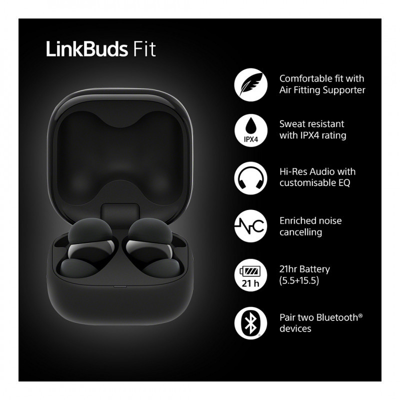 Sony LinkBuds Fit – pažangios True Wireless ausinės, skirtos patogiam kasdieniam muzikos klausymui, skambučiams ir sportui. Juodos spalvos dizainas yra modernus ir diskretiškas, o ergonomiškas įstatymas užtikrina stabilų ir komfortišką nešiojimą. Stereo garsas suteikia aiškų ir kokybišką garso atkūrimą, o belaidė sąsaja leidžia laisvai judėti be laidų.