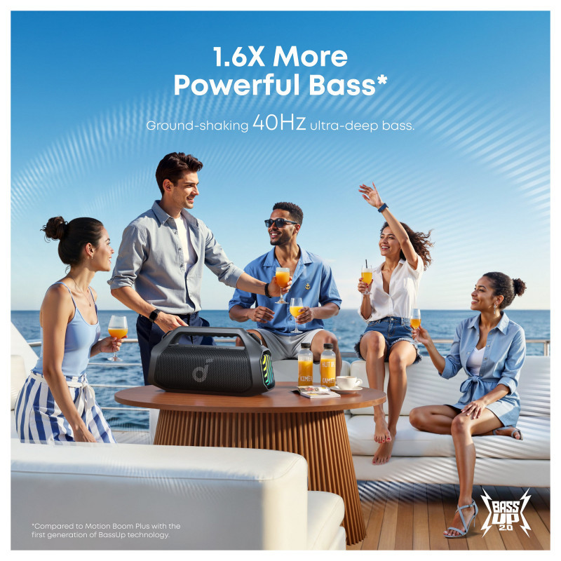 "Soundcore Boom 2 Pro. RMS rated power: 140 W, Woofer RMS power: 50 W, Tweeter RMS power: 20 W. Connectivity technology: Wireless. Product type: 2.1 portable speaker system, Product colour: Black, Volume control: Buttons. Recommended usage: Universal. Battery type: Built-in battery, USB Type-C required charging power (min): 0.005 W, USB Type-C required charging power (max): 140 W"\n"Ultra-Deep Bass for Outdoor Adventures The Ultimate Speaker for Outdoor Adventures, Fishing Trips Relaxing on the Beach