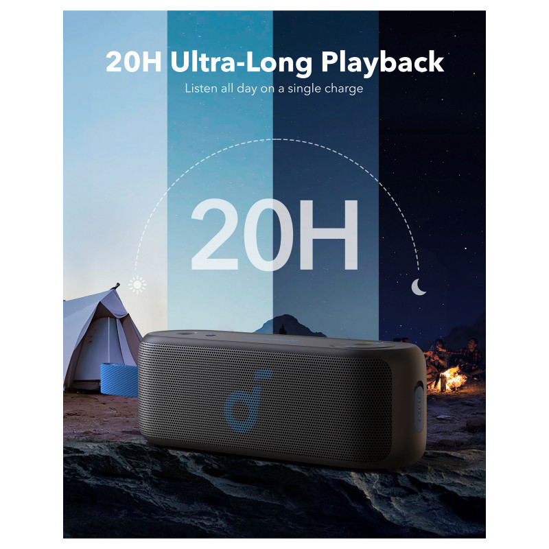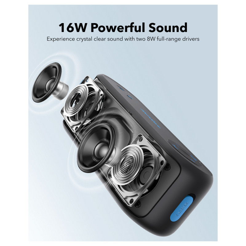 "Soundcore Select 3. Driver diameter: 3.75 mm. RMS rated power: 16 W, Frequency range: 70 - 20000 Hz. Connectivity technology: Wireless, Frequency range: 2.402 - 2.48 GHz, Bluetooth profiles: A2DP, AVRCP, HFP. Product type: Stereo portable speaker, Product colour: Grey, Blue, Product design: Rectangle. Recommended usage: Universal"\n"16W Stereo Sound and Dual Full-Range Drivers