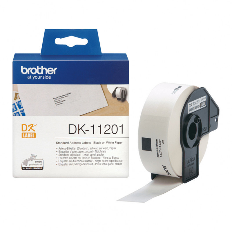 "Brother Standard address labels. Label colour: Black on white, Labels per roll: 400 pc(s), Tape type: DK. Width: 54 mm, Depth: 115 mm, Height: 112 mm. Pallet gross height: 15.9 cm, Master (outer) cases per pallet: 36 pc(s), Layers per pallet: 9 pc(s)"\n"These Genuine Brother DK-11201 Black on White labels come in handy for a wide range of your general labelling needs. For use in both the home and office environment, these pre-cut standard address labels can be used to display logos, barcodes, visitor badges or shipping information."