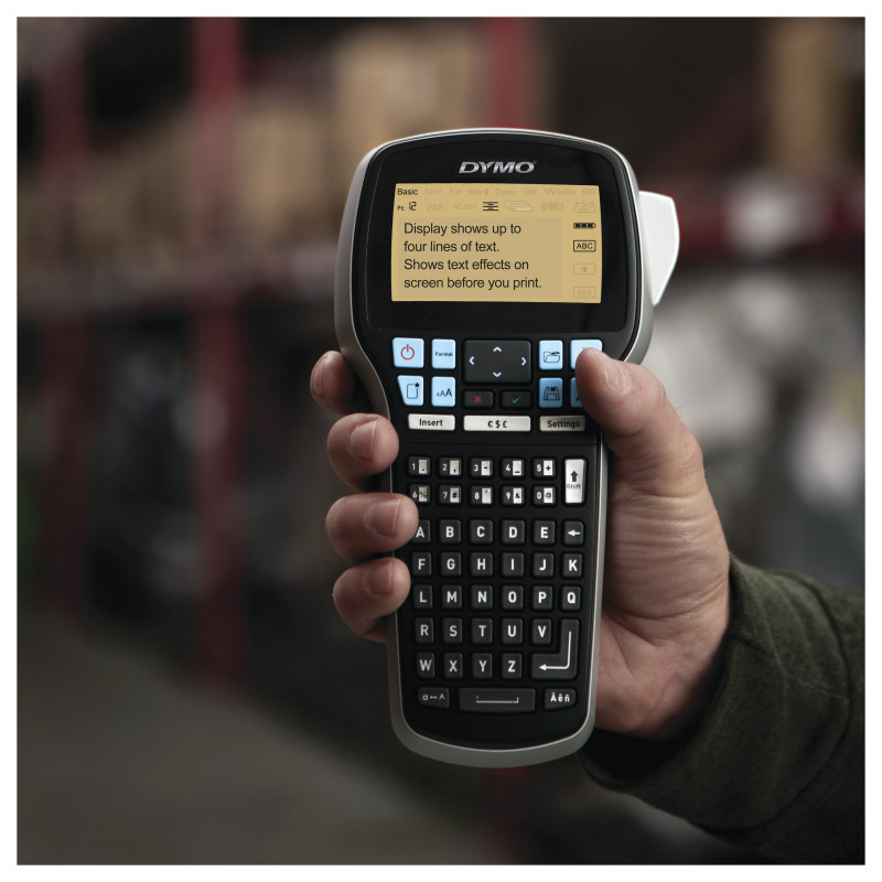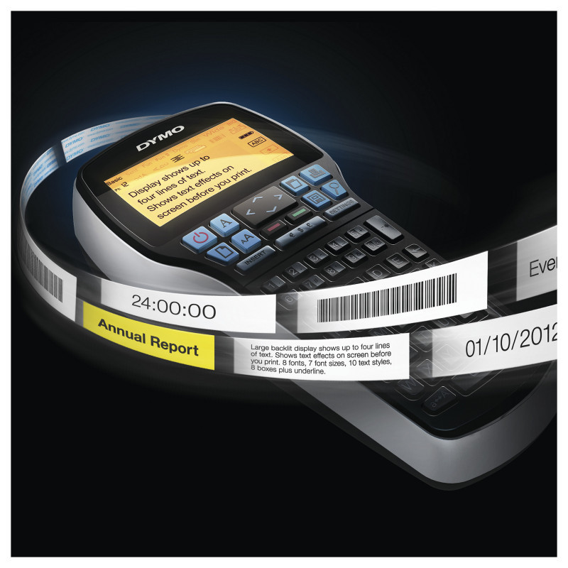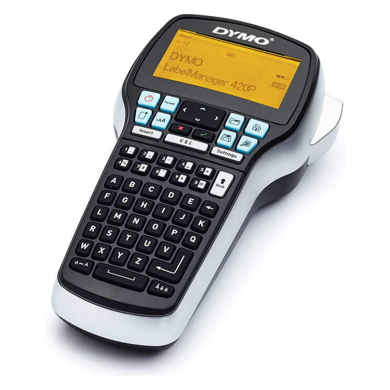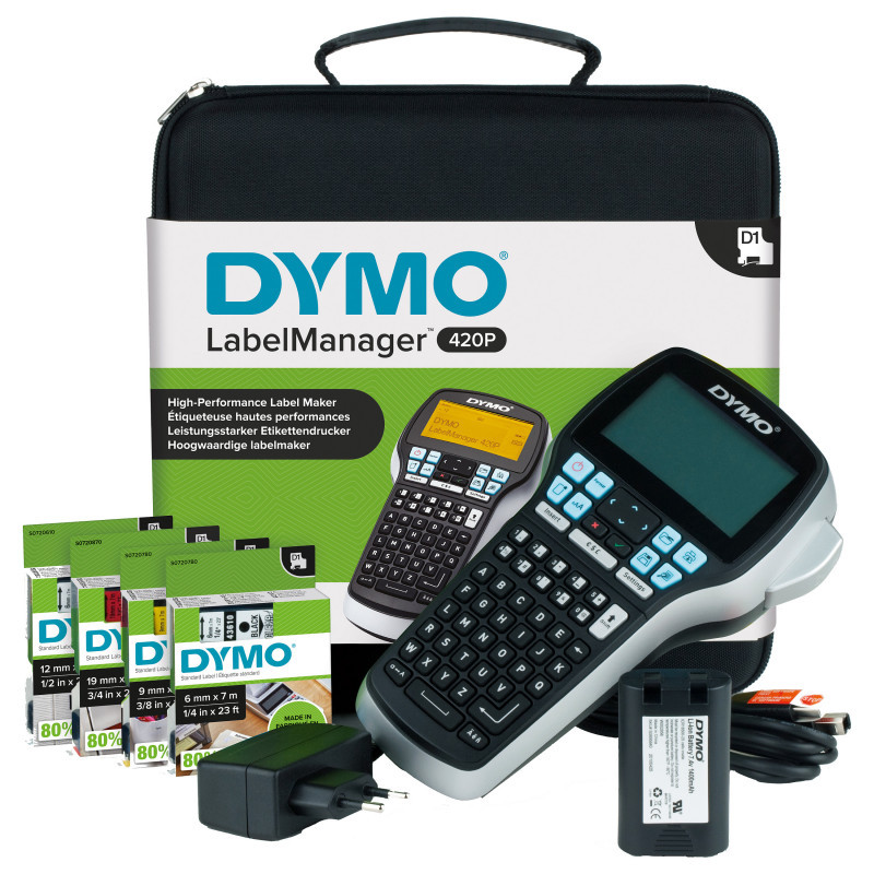 "DYMO LabelManager 420P High Performance Rechargeable Portable Label Maker Kit | ABC Keyboard with 4 Rolls of D1 Labels & Carrying Case. USB port. Product colour: Black, Grey"\n"A portable, high-performance label maker, the LabelManager 420P features a convenient rechargeable battery pack, a large backlit display and a user interface with quick access to keys, fonts and text effects. Connect the unit to your PC or Mac and use DYMO Label software to design labels with barcodes, logos and graphics on your computer screen or to print batches of labels from text in spreadsheet or database files. This complete labelling kit includes everything you need including the label maker, 4 rolls of D1 labels, 2 AC adapters (EU and UK), Rechargeable battery pack and a storage case."