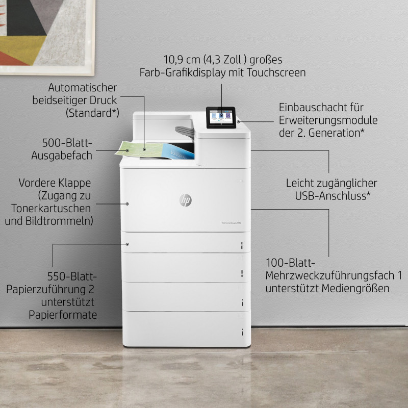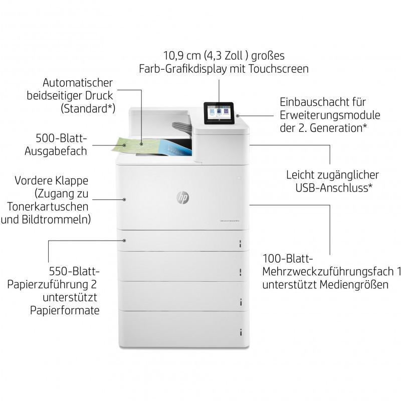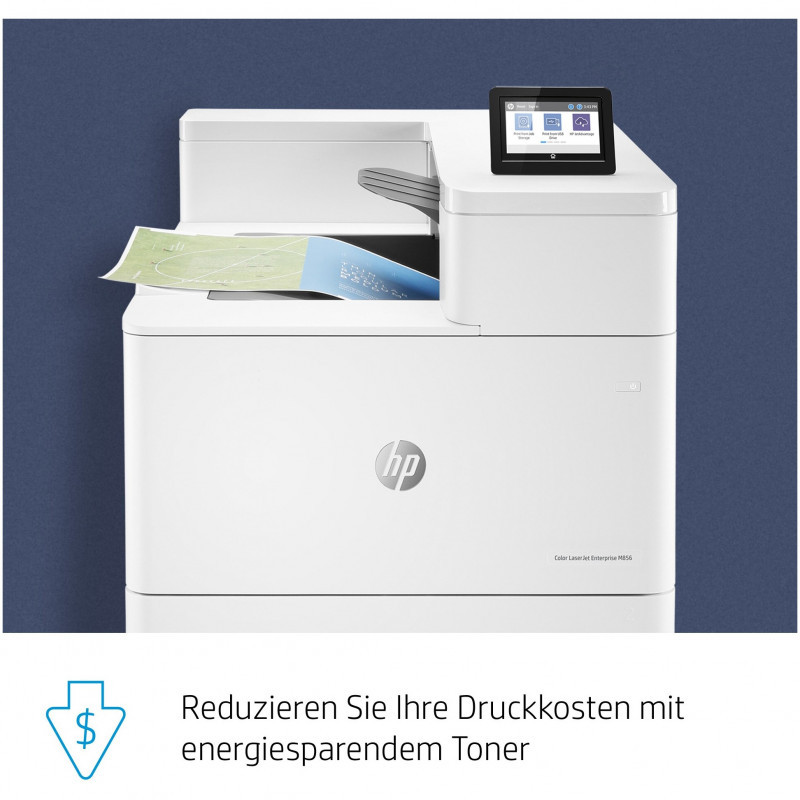 "HP Color LaserJet Enterprise M856dn. Print technology: Laser, Colour. Number of print cartridges: 4, Maximum duty cycle: 250000 pages per month. Maximum resolution: 1200 x 1200 DPI. Maximum ISO A-series paper size: A3. Print speed (black, normal quality, A4/US Letter): 56 ppm, Duplex printing. Display: CGD. Network ready. Product colour: White"\n" Print phenomenal colour while maximising uptime – now with original HP JetIntelligence toner technology. Expect consistently fast output, brilliant prints, and the world’s strongest security.[1]