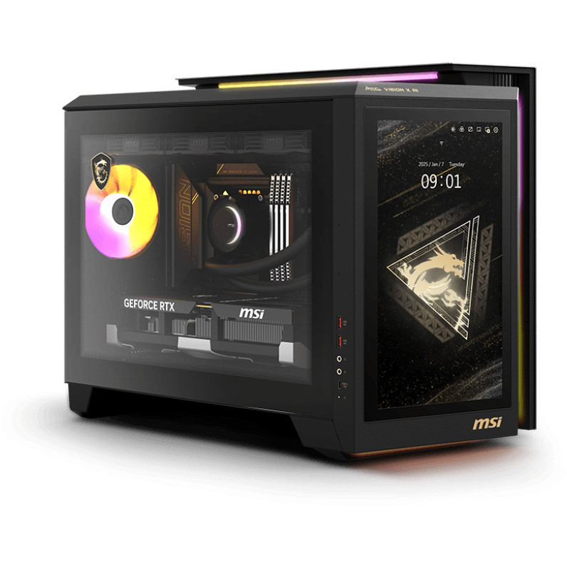 "MSI MEG Vision X AI 2NVZ9-234AT. Processor family: Intel Core Ultra 9, Processor model: 285K. Internal memory: 128 GB, Internal memory type: DDR5-SDRAM, Memory clock speed: 6000 MHz. Total storage capacity: 2 TB, Storage media: SSD. On-board graphics card model: Intel® Graphics, Discrete graphics card model: NVIDIA GeForce RTX 5090. Operating system installed: Windows 11 Home. Power supply: 1200 W. Chassis type: Desktop. Product type: PC. Weight: 18.2 kg. Product colour: Black"\n"The MEG VISION X AI integrates MSI's latest AI technology into its front touchscreen, the AI HMI, and is equipped with the latest CPU and a powerful graphics card. Enhanced by Silent Storm Cooling AI technology, it unleashes unprecedented gaming performance through a unique AI gaming experience. Join fellow gamers in exploring the limitless possibilities of AI!