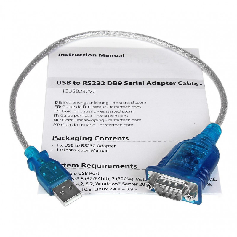 "StarTech.com 17in (43cm) 1-Port USB to RS232 DB9 Serial Adapter Cable, USB to Serial Adapter Cable - M/M. Product colour: Grey, Cable length: 0.43 m, Connector 1: USB 2.0 Type-A. Quantity per pack: 1 pc(s), Package width: 200 mm, Package depth: 220 mm. Certification: CE, FCC, REACH, RoHS. Weight: 40 g. Master (outer) case width: 355 mm, Master (outer) case length: 565 mm, Master (outer) case height: 292 mm"\n"Add an RS232 serial port to your laptop or desktop computer through USB
