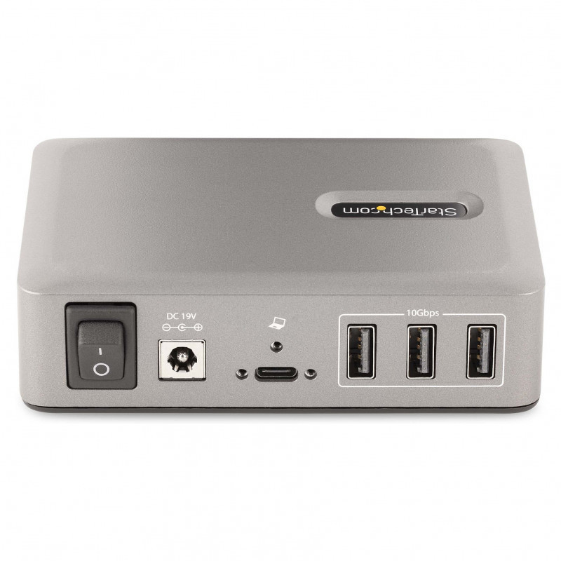"StarTech.com 10-Port USB-C Hub - 8x USB-A/2x USB-C - Self-Powered w/65W Power Supply - USB 3.1 10Gbps - Desktop/Laptop USB Hub w/USB-IF Certified 3ft Locking Cable, USB C Hub. Host interface: USB 3.2 Gen 2 (3.1 Gen 2) Type-C, Hub interfaces: USB 3.2 Gen 2 (3.1 Gen 2) Type-A, USB 3.2 Gen 2 (3.1 Gen 2) Type-C. Data transfer rate: 10000 Mbit/s, Product colour: Grey, LED indicators: Status. Power supply type: DC, Power consumption (typical): 65 W, Input voltage: 110 - 240 V. Width: 80 mm, Depth: 115 mm, Height: 30 mm. Package width: 170 mm, Package depth: 25 mm, Package height: 93 mm"\n"Add 8x USB-A and 2x USB-C ports to a USB-C enabled Desktop/Laptop
