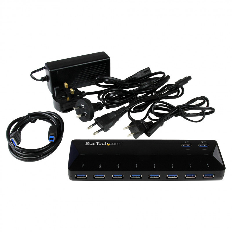 "StarTech.com 10-Port USB 3.0 Hub with Charge and Sync Ports - 2 x 1.5A Ports~10-Port USB 3.0 Hub with Charge and Sync Ports - 5Gbps - 2 x 1.5A Ports. Host interface: USB 3.2 Gen 1 (3.1 Gen 1) Type-B, Hub interfaces: USB 3.2 Gen 1 (3.1 Gen 1) Type-A. Data transfer rate: 5000 Mbit/s, Product colour: Black, Housing material: Plastic. Power supply type: DC, Power consumption (typical): 48 W, Input voltage: 100 - 240 V. Width: 60 mm, Depth: 201 mm, Height: 24 mm. Package width: 293 mm, Package depth: 194 mm, Package height: 73 mm"\n"Add ten USB 3.2 Gen 1 ports, including two charging downstream ports, to your computer