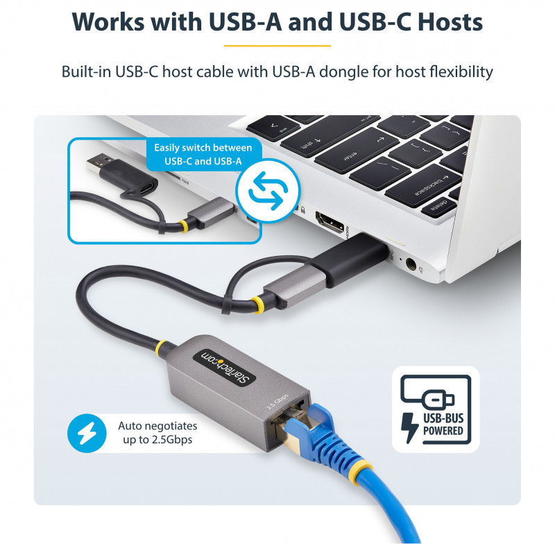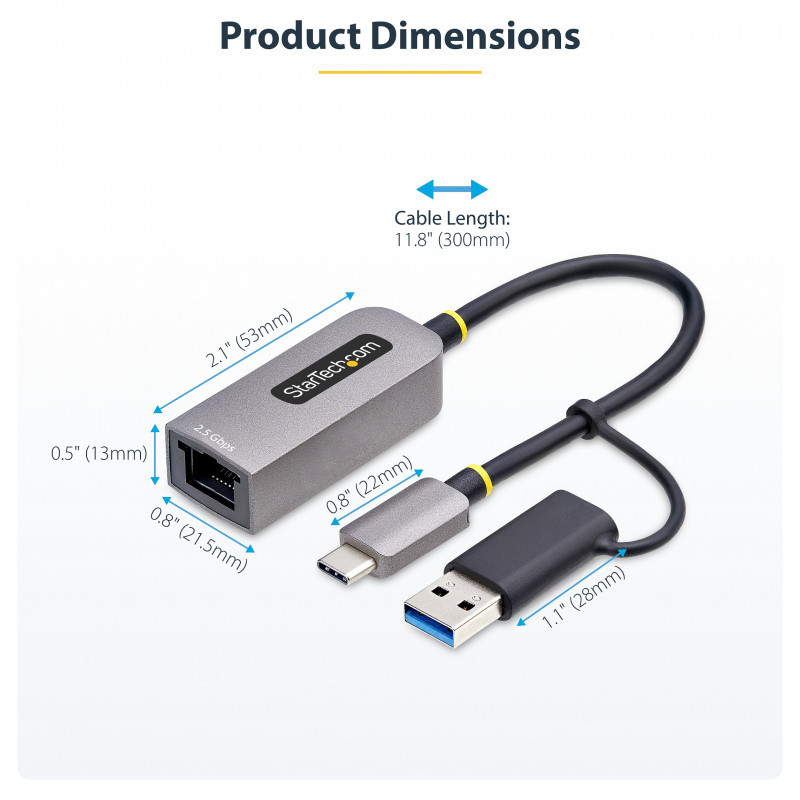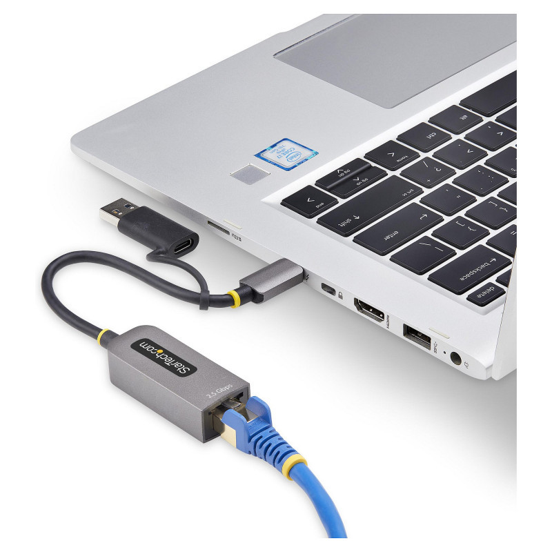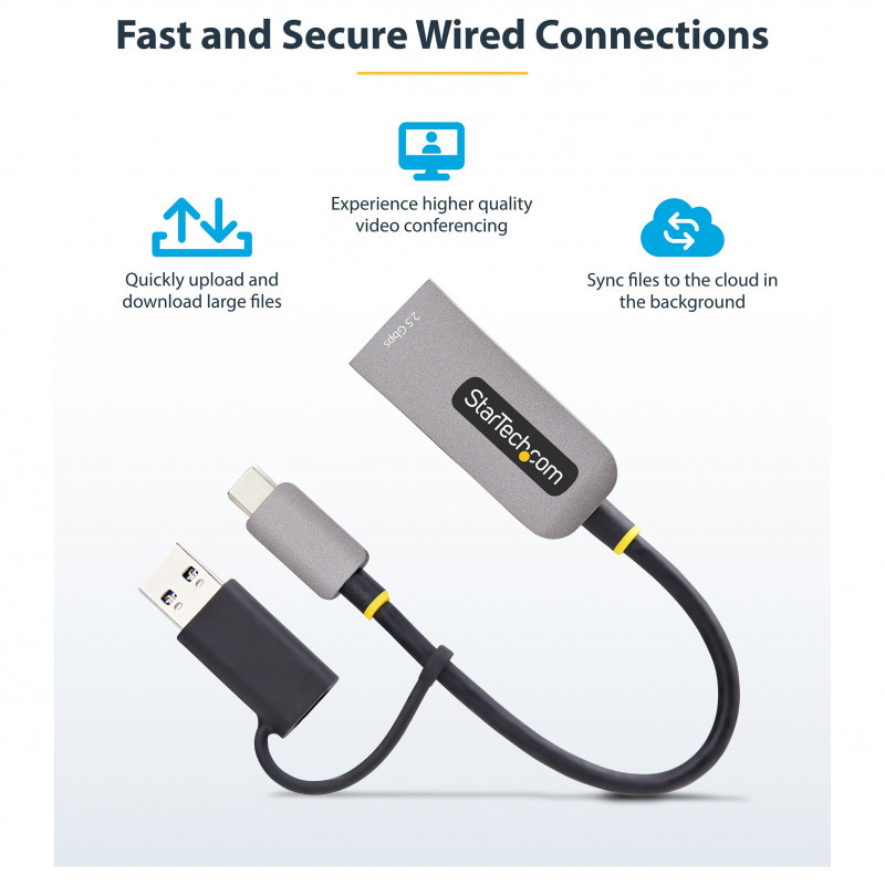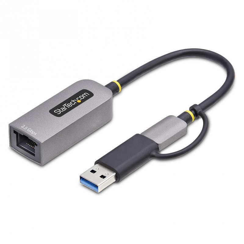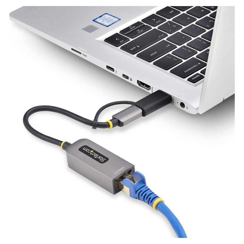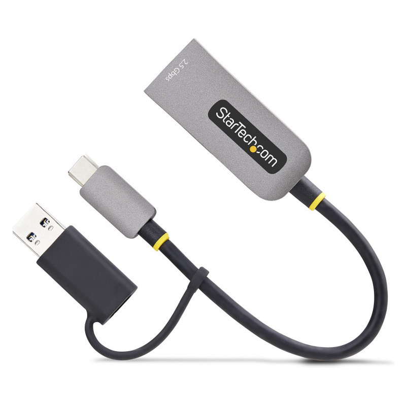 "StarTech.com 2.5GbE USB-C to Ethernet Adapter with USB-A Converter, NBASE-T NIC, USB 3.0 Type-C 2.5/1G Multi Speed Network, Thunderbolt Compatible, Windows & Mac. Connectivity technology: Wired, Host interface: USB Type-C, Interface: Ethernet. Maximum data transfer rate: 5000 Mbit/s. USB powered. Product colour: Grey"\n"Add a 2.5Gb Ethernet port to your MacBook, Chromebook™ or laptop with USB-C or Thunderbolt™ 3