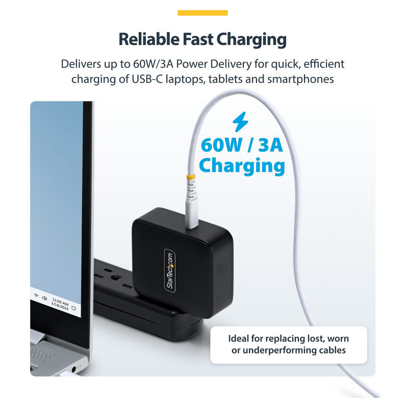 "StarTech.com 2m (6ft) White USB-C Charging Cable, 60W (3A) PD, Dual-Layer Braided Nylon/TPE Jacket, Rugged USB C Charging Cord, USB 2.0 Laptop Charger Cable. Cable length: 2 m. Connector 1: USB C, Connector 2: USB C, USB version: USB 2.0, Maximum data transfer rate: 0.48 Gbit/s, Connector contacts plating: Nickel, Product colour: White"\n"Connect a USB Type-C device to a USB-C wall charger or host computer