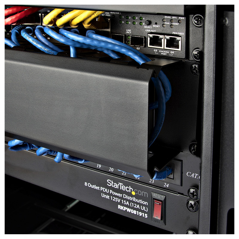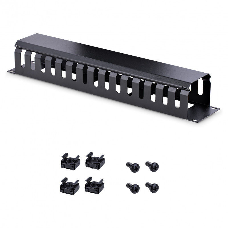 "StarTech.com Horizontal 2U Server Rack Cable Management Finger Duct w/ Cover - 19"" Network Rack Wire Duct Raceway Panel - Slotted Wire Duct. Type: Cable management panel, Housing material: Plastic, Steel, Product colour: Black. Weight: 972 g"\n"Organize cables in your server rack or cabinet with a horizontal, covered cable duct