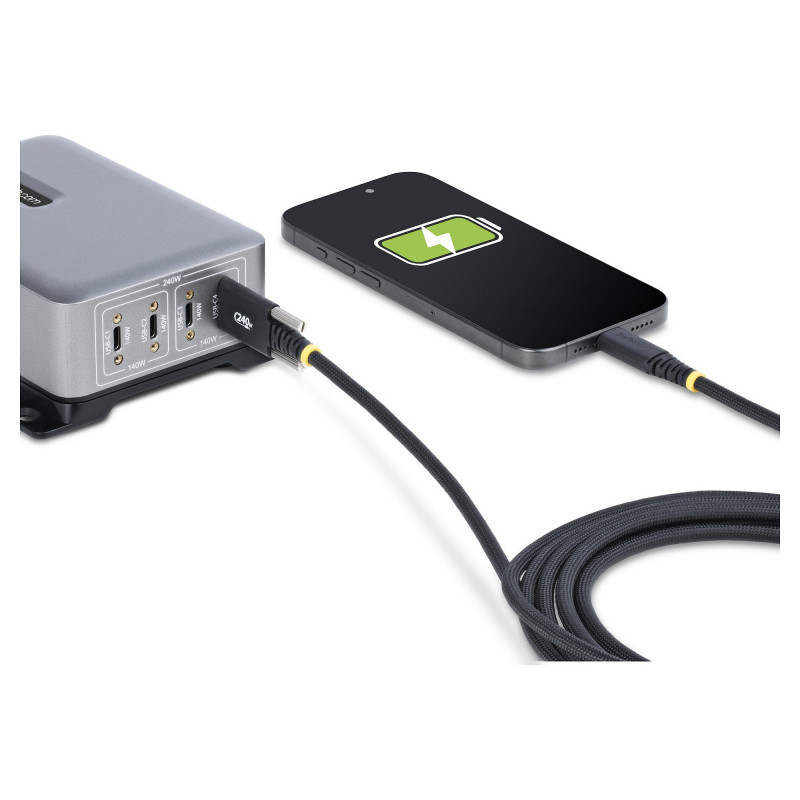Connect a charger or hub to a USB Power Delivery (PD) 3.1-enabled device, using this USB-C Charging Cable. The USB-C charger cord delivers up to 240W of Extended Power Range (EPR) Power Delivery and 5A output for fast charging. The connector markings enable quick visual identification, distinguishing it from other similar-looking or unmarked USB-C cables. Eliminate guesswork and always choose the right Type-C cable to support full 240W charging.