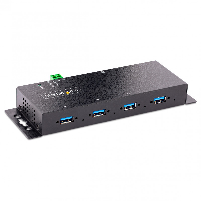 "StarTech.com 4-Port Industrial USB 3.0 Hub with ESD Protection~4-Port USB 3.0 Hub - 5Gbps - Metal Industrial USB-A Hub - Wall or Desk Mountable USB Data Hub - TAA Compliant USB Expander Hub. Host interface: USB 3.2 Gen 1 (3.1 Gen 1) Type-B, Hub interfaces: USB 3.2 Gen 1 (3.1 Gen 1) Type-A. Data transfer rate: 5000 Mbit/s, Product colour: Black, Housing material: Steel. Power consumption (typical): 36 W, Output voltage: 12 V, Output current: 3 A. Windows operating systems supported: Windows 10 Education, Windows 10 Education x64, Windows 10 Enterprise, Windows 10 Enterprise x64,..., Mac operating systems supported: Mac OS X 10.4 Tiger, Mac OS X 10.5 Leopard, Mac OS X 10.6 Snow Leopard. Width: 59.6 mm, Depth: 152 mm, Height: 24 mm"\n"Industrial-grade | 8kV Air | 4kV Contact | Metal | Mountable | 5 Gbps
