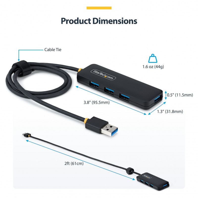 "StarTech.com 4-Port USB-A Hub, 5Gbps, Bus Powered, USB-A to 4x USB-A Mini Hub, Extra Long 2ft/61cm Host Cable, PCR Plastic, Portable Desktop / Laptop USB Hub. Host interface: USB 3.2 Gen 1 (3.1 Gen 1) Type-A, Hub interfaces: USB 3.2 Gen 1 (3.1 Gen 1) Type-A. Data transfer rate: 5000 Mbit/s, Product colour: Black, Housing material: Plastic. Power supply type: USB. Width: 31.8 mm, Depth: 95.5 mm, Height: 11.5 mm. Quantity per pack: 1 pc(s), Package width: 170 mm, Package depth: 100 mm"\n"Add four external USB 3.0 ports to your PC or laptop with a portable, PCR plastic hub