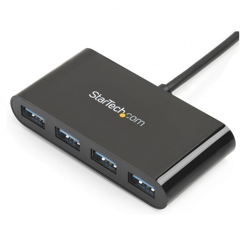 "StarTech.com 4-Port USB-C Hub - USB-C to 4x USB-A - USB 3.0 Hub - Bus Powered~4-Port USB-C Hub - USB-C to 4x USB-A - USB 3.0 Hub - 5Gbps - Bus Powered. Host interface: USB 3.2 Gen 1 (3.1 Gen 1) Type-C, Hub interfaces: USB 3.2 Gen 1 (3.1 Gen 1) Type-A. Data transfer rate: 5000 Mbit/s, Product colour: Black, Housing material: Plastic. Width: 41 mm, Depth: 80 mm, Height: 15 mm. Package width: 142 mm, Package depth: 170 mm, Package height: 30 mm. Master (outer) case width: 330 mm, Master (outer) case length: 530 mm, Master (outer) case height: 310 mm"\n"Turn your laptop’s USB Type-C port into four USB Type-A ports (5Gbps) using this bus-powered hub