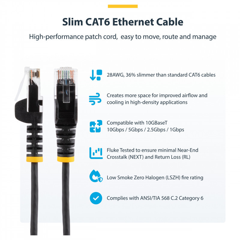 The Slim Cat6 Patch Cord is 36% thinner than standard Cat6 Ethernet cables, enabling greater airflow and heat dissipation in confined spaces. The Slim Cat6 Ethernet cable is also more flexible, for easier cable routing in crowded network racks and patch panels.