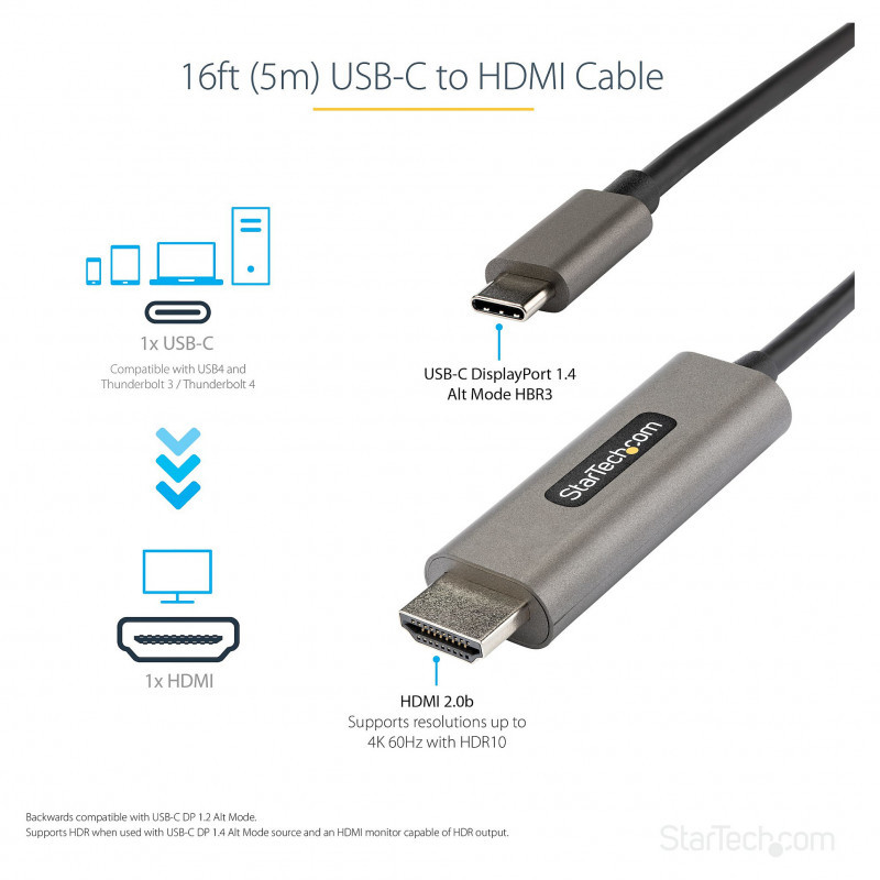 "StarTech.com 16ft (5m) USB C to HDMI Cable 4K 60Hz w/ HDR10 - Ultra HD USB Type-C to 4K HDMI 2.0b Video Adapter Cable - USB-C to HDMI HDR Monitor/Display Converter - DP 1.4 Alt Mode HBR3. Cable length: 5 m, Connector 1: HDMI Type A (Standard), Connector 2: USB Type-C. Compliance certificates: CE, RoHS. Weight: 199 g, Width: 12 mm, Height: 22 mm. Package width: 17 mm, Package depth: 5000 mm, Package height: 6 mm. Quantity per pack: 1 pc(s)"\n"USB Type-C™ Adapter Cable | HDR10 | Ultra HD | Thunderbolt™ 3 Host Compatible