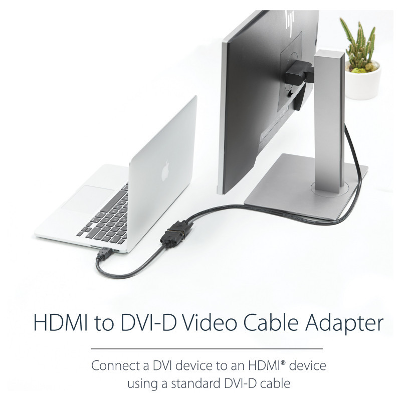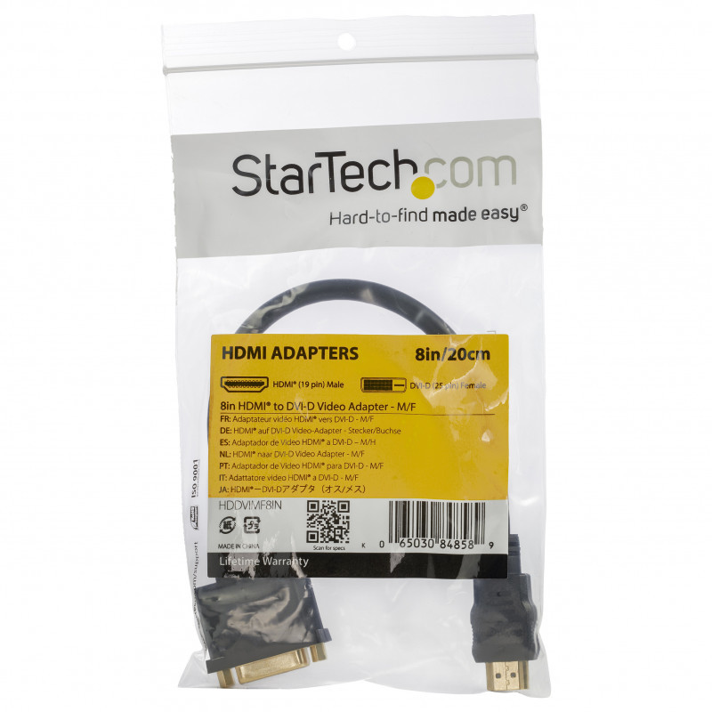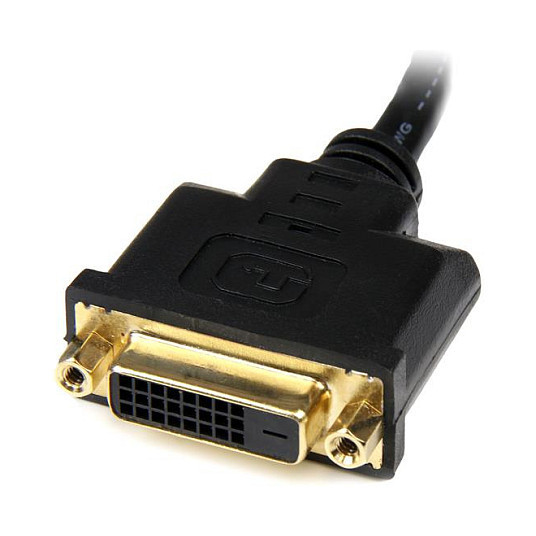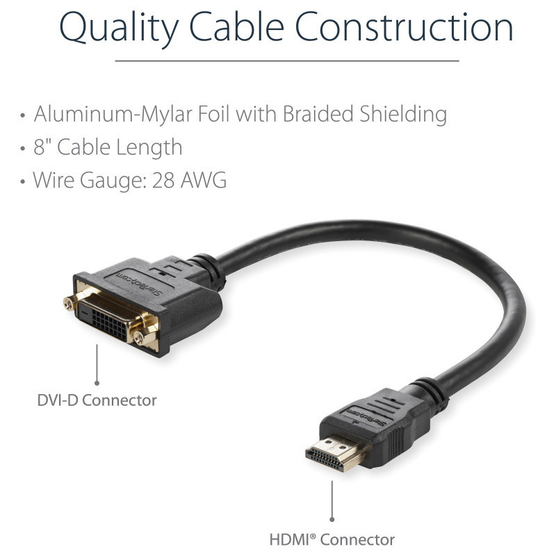 "StarTech.com 8in HDMI to DVI-D Video Cable Adapter - HDMI Male to DVI Female. Cable length: 0.2 m, Connector 1: HDMI, Connector 2: DVI-D. Compliance certificates: RoHS, Certification: REACH. Weight: 52 g, Depth: 203.2 mm. Package width: 125 mm, Package depth: 225 mm, Package height: 17 mm. Material: Aluminium, PVC"\n"Connect a DVI device to an HDMI enabled device using a standard DVI-D cable