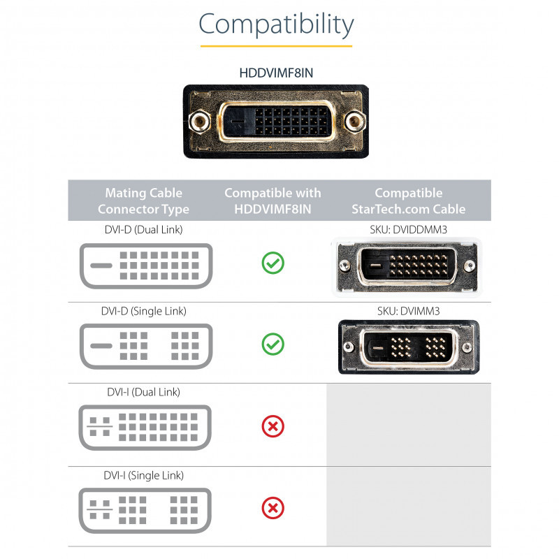 The HDDVIMF8IN HDMI to DVI Cable Adapter features one HDMI male connector and one DVI-D female connector, which enables a bi-directional connection between HDMI-capable devices and DVI-D capable devices to overcome compatibility issues.