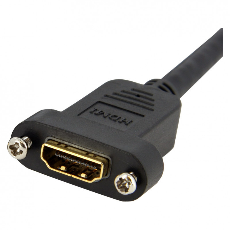 "StarTech.com 3ft HDMI Female to Male Adapter, 4K High Speed Panel Mount HDMI Cable, 4K 30Hz UHD HDMI, 10.2 Gbps Bandwdith, 4K HDMI Female to HDMI Male, HDMI Panel Mount Connector Cable. Cable length: 0.9 m, Connector 1: HDMI Type A (Standard), Connector 1 gender: Male, Connector 2: HDMI Type A (Standard), Connector 2 gender: Female, Connector contacts plating: Gold, HDMI version: 1.4, 3D, Data transfer rate: 10.2 Gbit/s, Audio Return Channel (ARC), Product colour: Black"\n"Allows an HDMI® connection to be mounted on a secure and easily accessible panel.