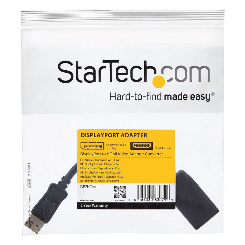 "StarTech.com DisplayPort to HDMI Adapter - DP to HDMI Adapter/Video Converter - 1080p - VESA Certified - DP to HDMI Monitor/Display/Projector Adapter Dongle - Passive - Latching DP Connector. Cable length: 0.24 m, Connector 1: HDMI Type A (Standard), Connector 2: DisplayPort. Compliance certificates: CE, RoHS. Weight: 50 g, Depth: 240 mm. Package width: 200 mm, Package depth: 220 mm, Package height: 14 mm. Master (outer) case width: 338 mm, Master (outer) case length: 500 mm, Master (outer) case height: 222 mm"\n"Connect your HDMI® monitor or HDTV to a DisplayPort® equipped computer