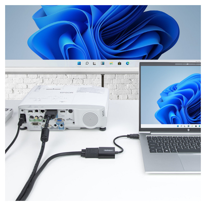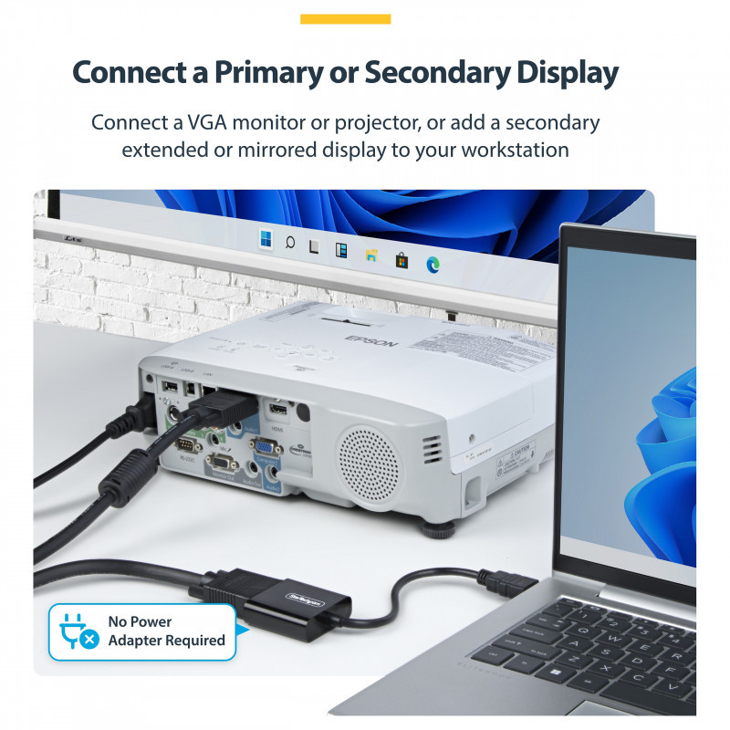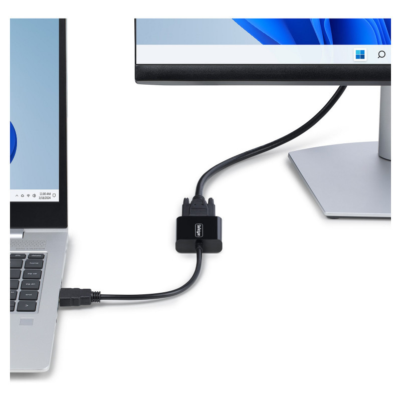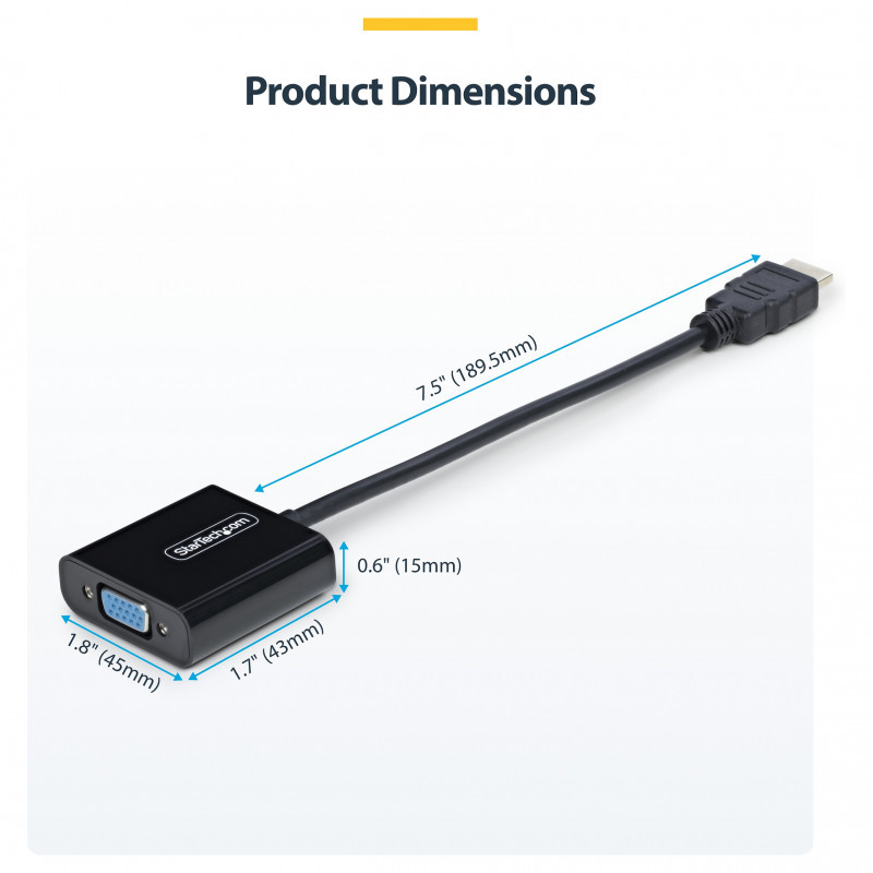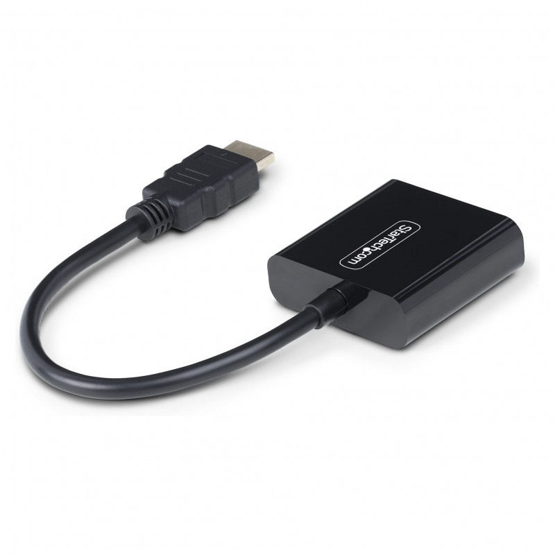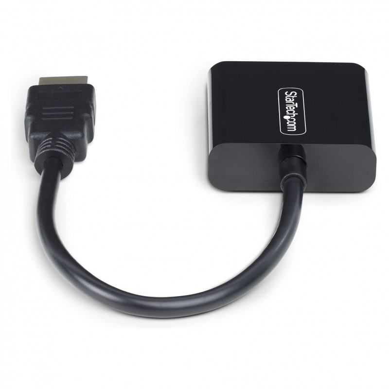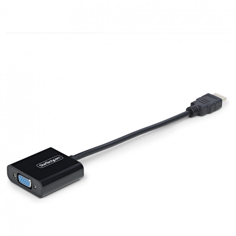 "StarTech.com HDMI to VGA Adapter, Active Video Converter For Laptop/Desktop, 1920x1080 (1080p), HDMI Source to VGA Monitor/Display/Projector. Converter type: Active video converter, Housing material: Plastic, Cable length: 0.189 m. Maximum video resolution: 1920 x 1200 pixels, Video resolutions: 800 x 600,1024 x 768,1280 x 720,1280 x 800,1600 x 1200,1680 x 1050,1920 x 1080,1920 x 1200, Supported video modes: 1080p. Host interface: HDMI, Output interface: VGA. Width: 45 mm, Depth: 234 mm, Height: 15 mm. Package width: 50 mm, Package depth: 50 mm, Package height: 18 mm"\n"Connect an HDMI-enabled laptop or desktop to a VGA display or projector