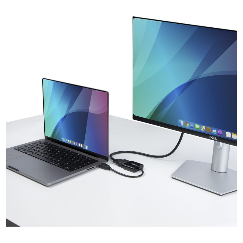 The adapter reduces clutter and simplifies setup by eliminating the need for an external power adapter or USB power connection. The Adapter has a compact and lightweight design, making it ideal for travel or on-the-go use. This black video adapter features a 5mm cable outer diameter, and a cable length of 5.8 inches (14.7 cm).